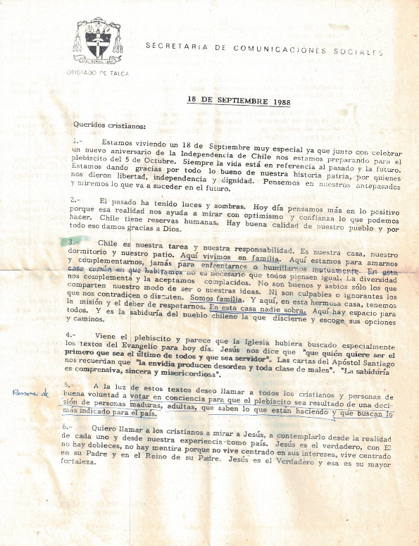 González Cruchaga, Carlos., “Carta Pastoral: 18 de septiembre 1988.,” Archivo Carlos González Cruchaga, consulta 28 de noviembre de 2025, https://archivocarlosgonzalez.cftsa.cl/items/show/124.
