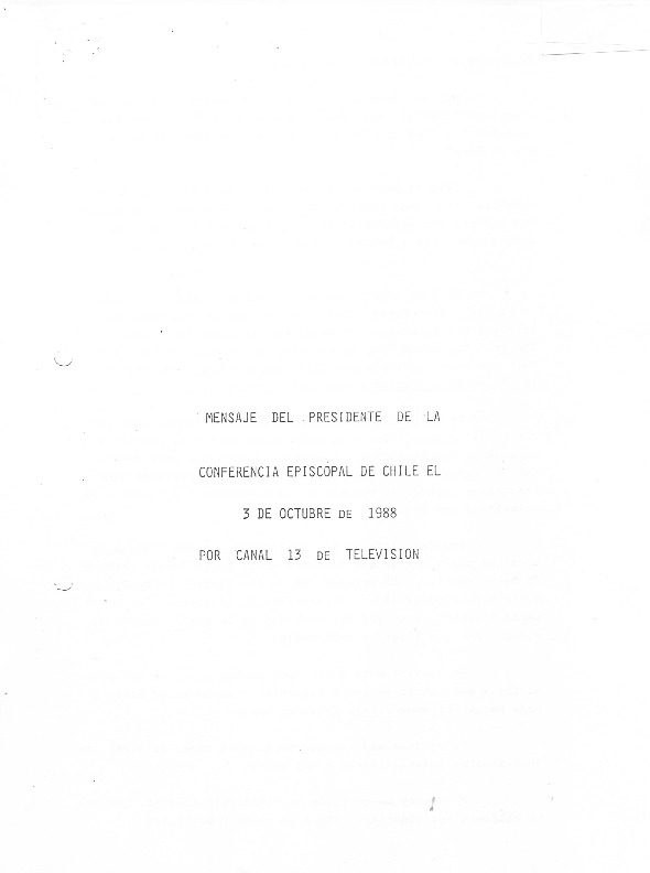 Mensaje del Presidente de la Conferencia Episcopal de Chile (CECH) el 3 de Octubre de 1988 por Canal 13 de televisión.